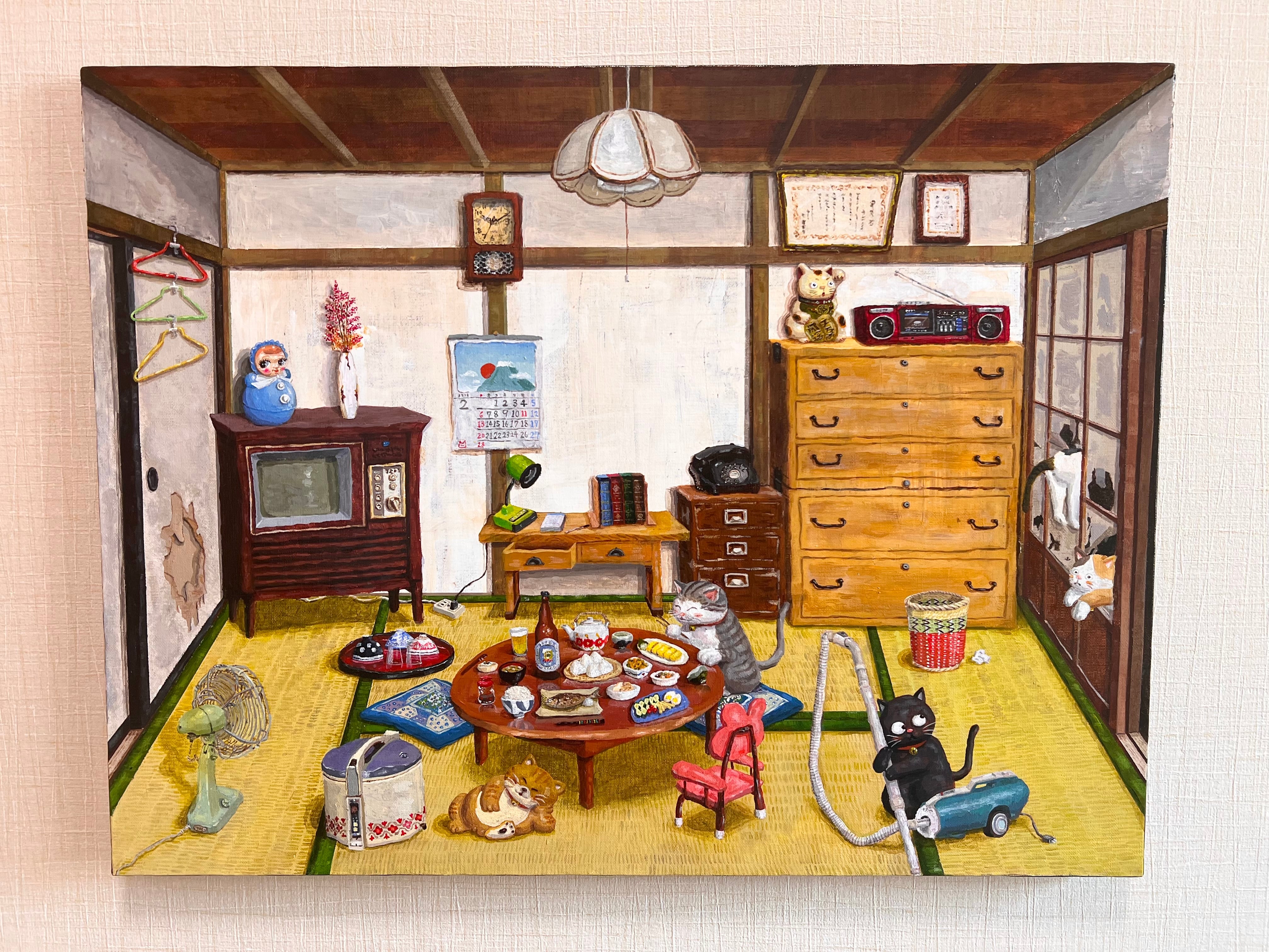 ドールハウスに見立てたキャンバスの中にレトロ家具の数々を詰め込み、昭和のノスタルジックな情景を描き出しました。