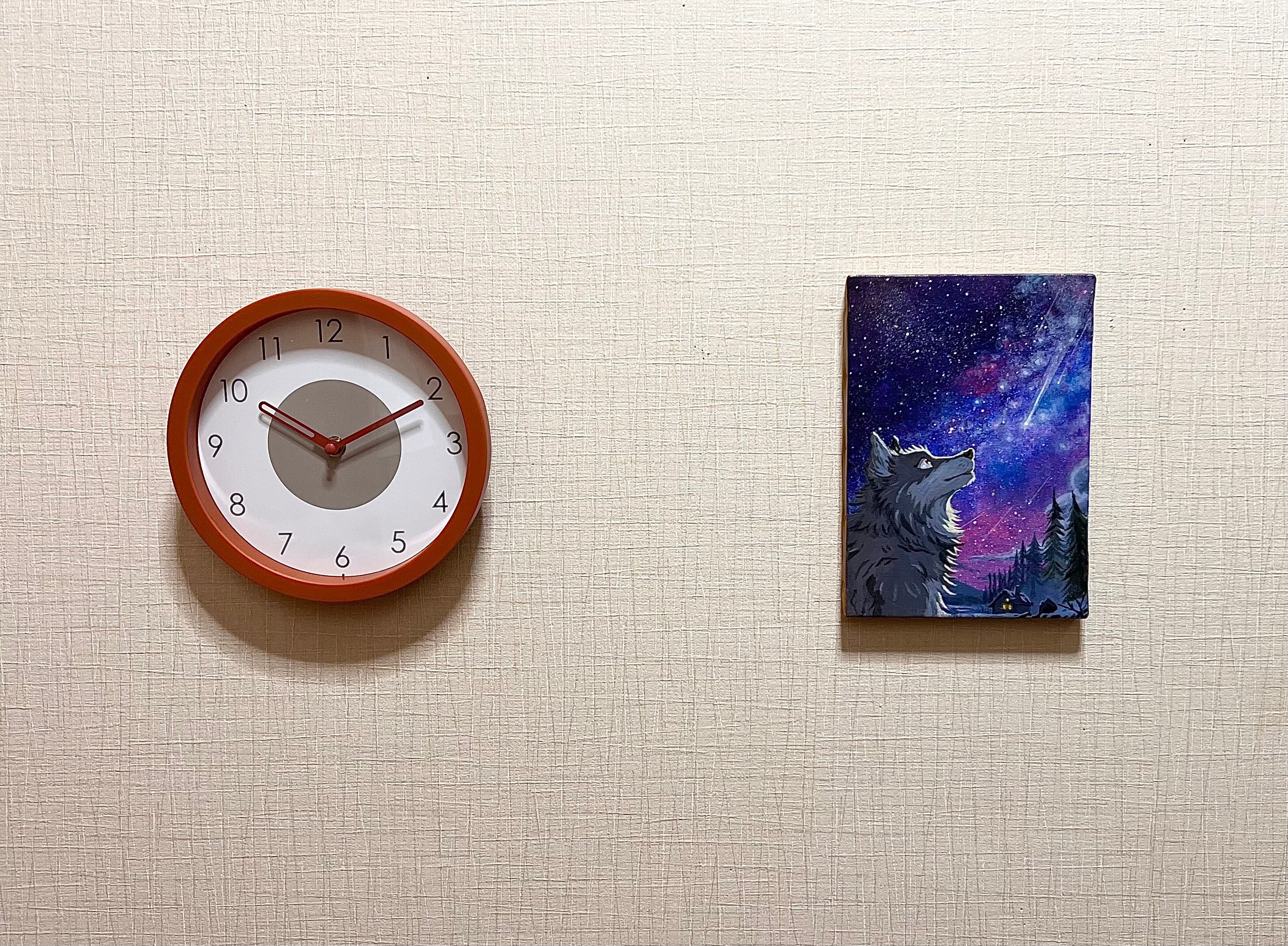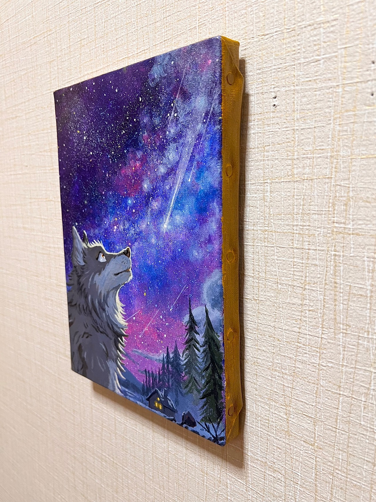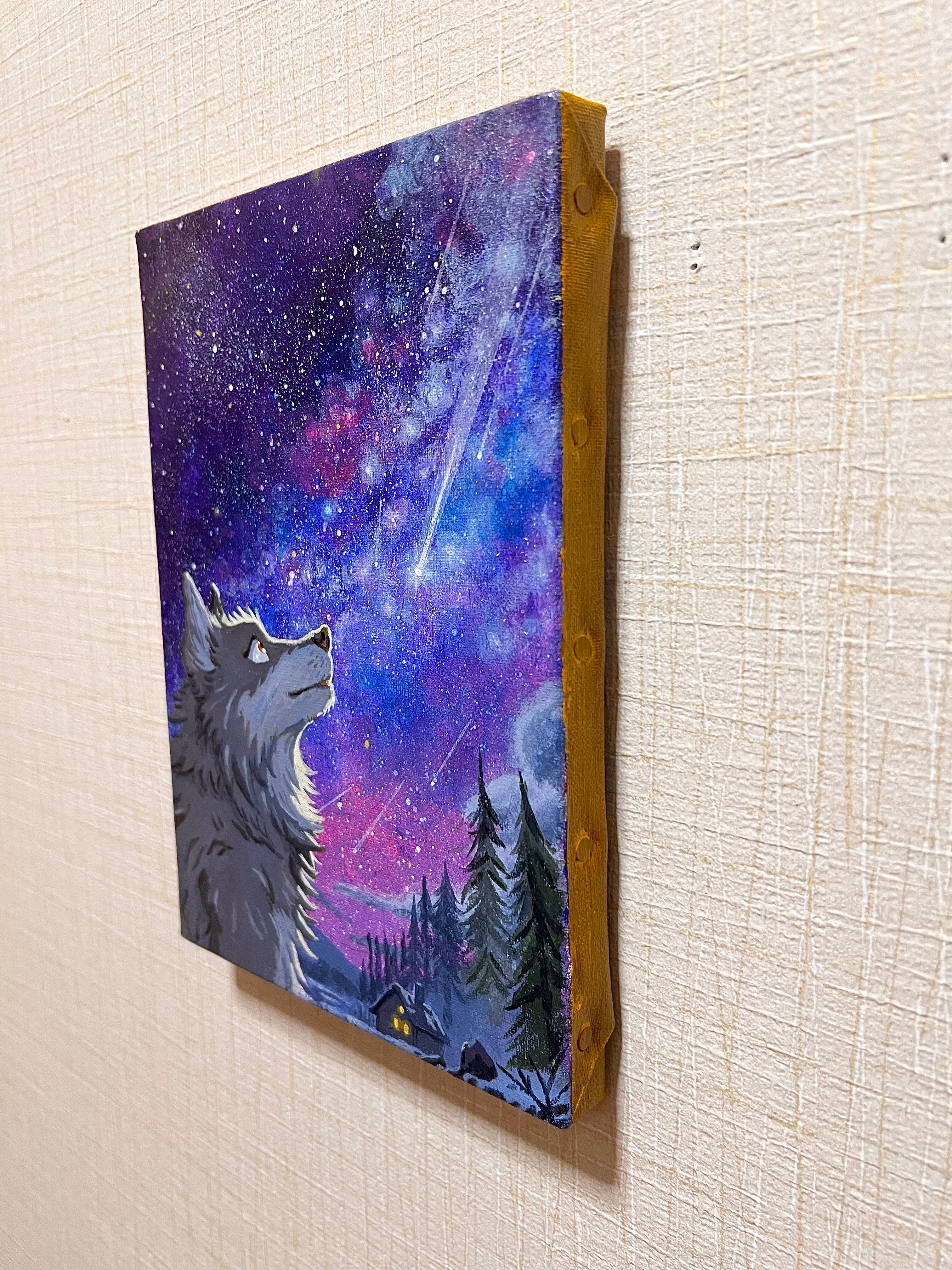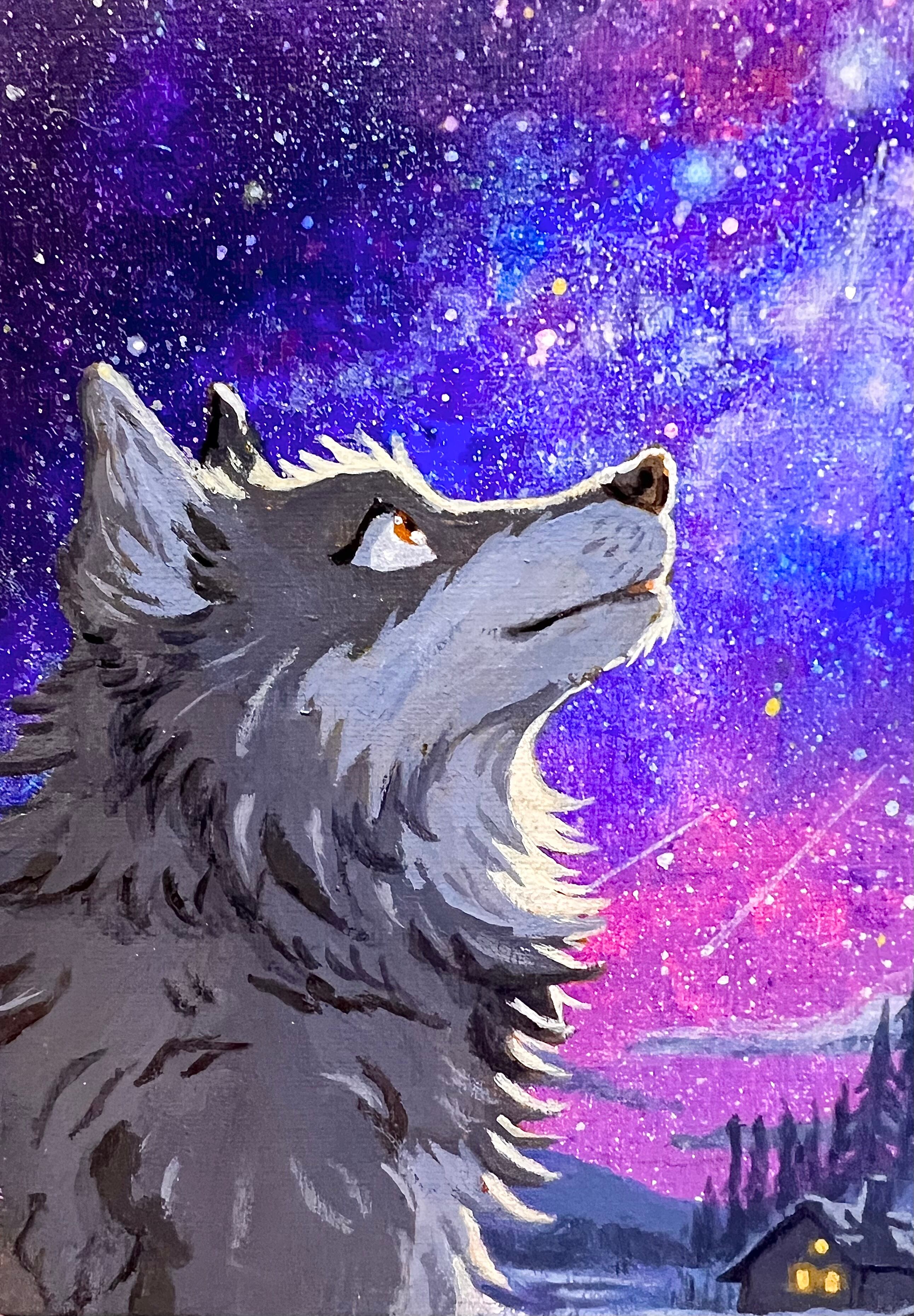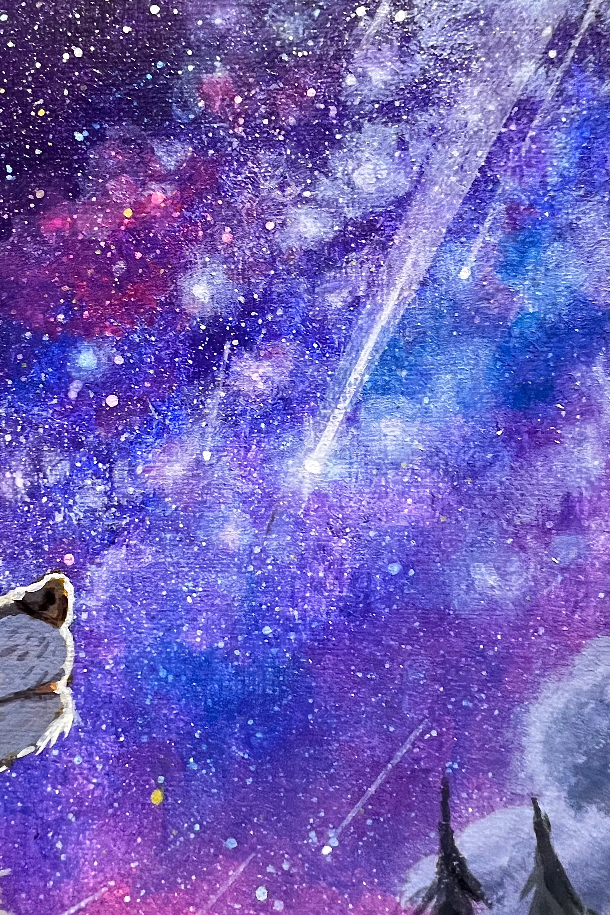 複数の色を重ねて空に奥行きを出し、ドリッピング技法(水分を含んだ絵の具を散らして着色する技法)にて雄大な星空を表現しました。